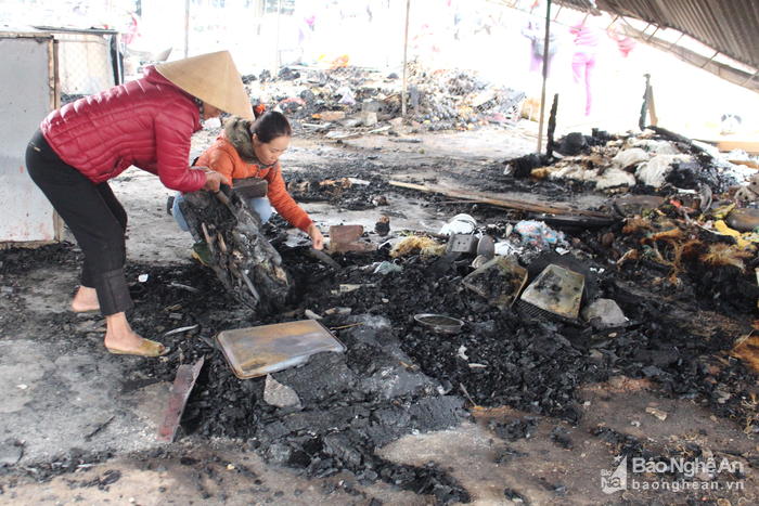 Các tiểu thương nhặt nhạnh những gì còn sót lại - Ảnh: Thái Hiền/ Báo Nghệ An |
