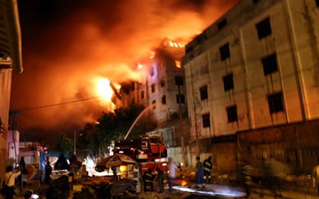 Đám cháy cơ bản được khống chế nhưng tòa nhà có nguy cơ bị sập (Ảnh: báo VOV) |