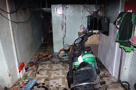Đồ đạc, bình gas, xe máy của người dân sống khu vực nói trên không kịp đi chuyển, bị lửa làm cháy sém - Ảnh: Thanh niên. |
