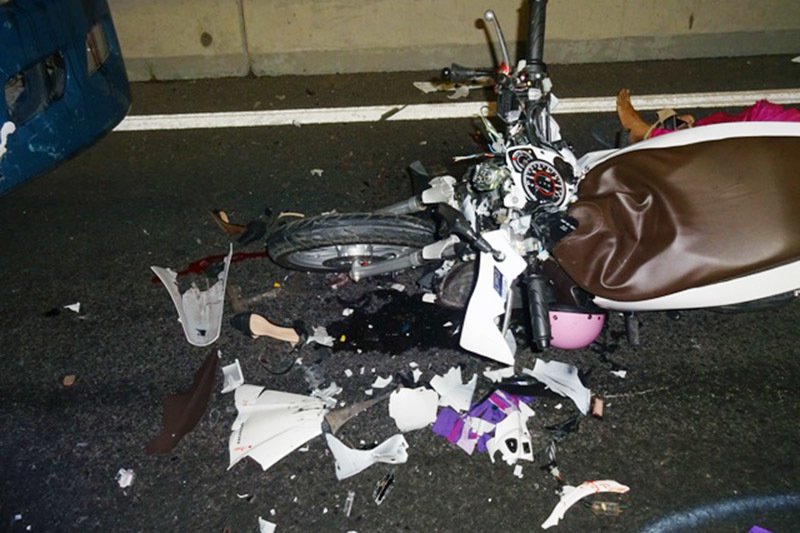 Cú tông mạnh khiến 2 cô gái ngã xuống đường, tử vong xe chỗ. Xe máy của nạn nhân bị biến dạng, vỡ nát phần đầu.