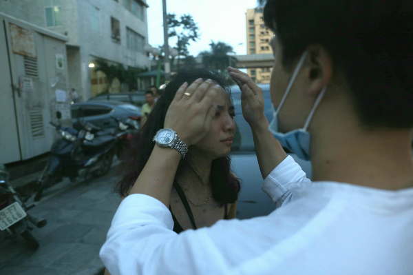 Người phụ nữ ở căn hộ đối diện nhà phát cháy thoát được ra ngoài, òa lên khóc. Ảnh: VnExpress |