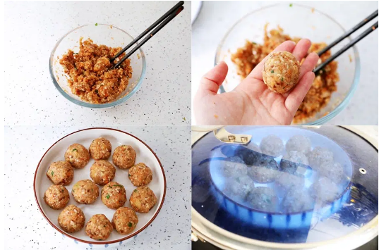 - Bước 2: Trộn đều thịt sau đó dùng tay viên thịt thành từng viên tròn nhỏ. Xếp thịt vào đĩa rồi cho đĩa thịt vào nồi hấp sôi khoảng 12-15 phút hoặc cho đến khi thịt chín là được.