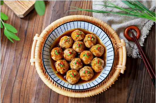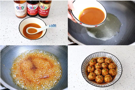 - Bước 4: Thịt sau khi hấp sẽ ra nước, chắt nước hấp ở đĩa thịt vào chảo. Tiếp theo đổ nước sốt vừa pha vào đun sôi cho đến khi xốt sánh lại là được. Đổ sốt lên trên đĩa thịt viên, thêm hành lá thái nhỏ vào là xong.
