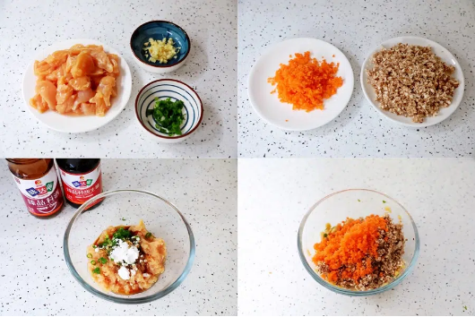 - Bước 1: Thịt gà băm nhỏ hoặc xay nhỏ rồi cho vào bát, thêm tinh bột ngô, rượu nấu ăn, muối, hạt tiêu và dầu mè vào trộn đều. Tiếp đó cho cà rốt và nấm hương vào.
