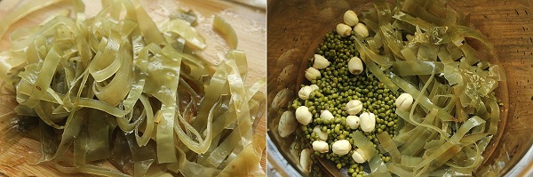 - Bước 2: Tảo bẹ rửa sạch ngâm trong nước cho đến khi tảo bẹ mềm và có khối lượng gấp 3, gấp 4 lần tảo bẹ khô là được. Thái tảo bẹ thành sợi. Cho đậu xanh, hạt sen đã ngâm vào nồi rồi thêm tảo bẹ vào.