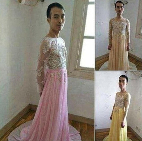 Một cô gái người Anh may mắn tìm thấy shop bán đồ dạ hội và váy cưới trên mạng đúng với ý thích của mình nên rất hào hứng muốn mua hàng. Nhưng cùng một mẫu váy lại có tới 5 màu khác nhau gồm hồng nhạt, tím, cam, vàng, màu đào và chiếc nào cũng đều làm từ chất liệu chiffon trong suốt, khoét lưng sexy, đính đá lấp lánh nên cô không thể chắc chắn rằng ở bên ngoài váy cũng đẹp y như trong hình nên đã yêu cầu chủ shop gửi ảnh thật cho mình xem.