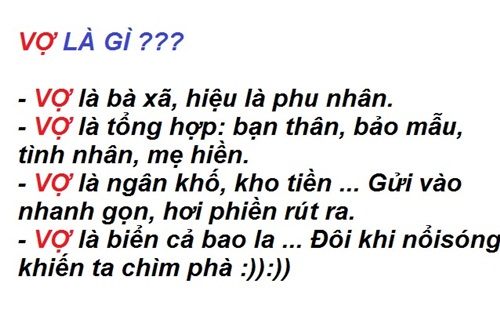 Về mặt triết học: Vợ là một thực thể độc lập tồn tại bên ngoài ta, ngoài ý muốn của ta, là phạm trù chỉ sự sợ hãi của đàn ông.