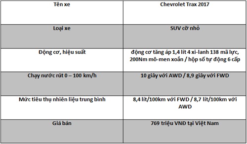 Còn ở thì hiện tại, General Motor Việt Nam giới thiệu đến khách hàng một phiên bản Trax duy nhất với tên gọi 1.4L Turbo LT với giá bán 769 triệu đồng, và xe được sản xuất tại Hàn Quốc. Rõ ràng Trax 2017 ở vị thế cao hơn nếu so sánh với EcoSport nội địa, khá tương đồng khi đặt cạnh Vitara đến từ Hungary, Creta cập cảng từ Ấn Độ, hay thậm chí là chỉ kém chính “đàn anh” Captiva hơn 100 triệu.