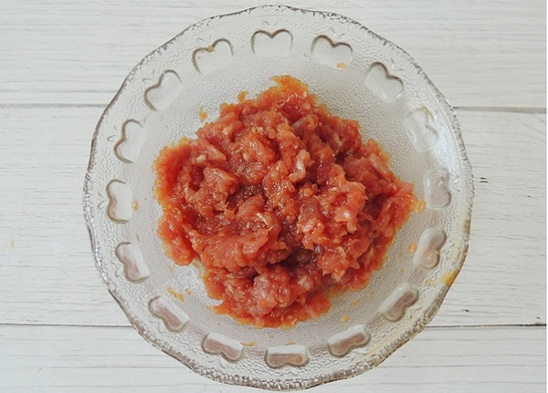 - Thịt rửa sạch băm nhỏ. Cho thịt vào bát, thêm nước tương, rượu nấu ăn và chút muối, chút tinh bột trộn đều rồi ướp khoảng 10 phút.