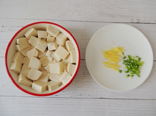 - Đậu phụ thái miếng vừa ăn, xếp vào bát tô hoặc đĩa sâu lòng.