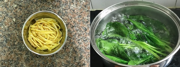 - Bước 1: Đun nóng chút dầu ăn trong chảo, cho trứng vào chiên chín rồi thái thành sợi.