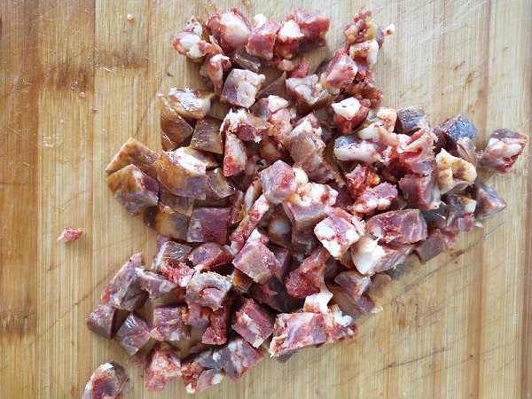 - Bước 1: Lạp xưởng thái hạt lựu.