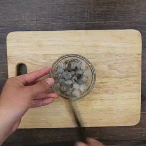- Bước 1: Tôm thái nhỏ, ướp với muối và tiêu rồi để trong bát cho ngấm gia vị.