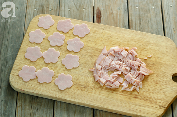 - Bước 3: Dùng cutter hình hoa cắt thịt thành những bông hoa, phần thịt còn dư cắt nhỏ để trộn với cơm.
