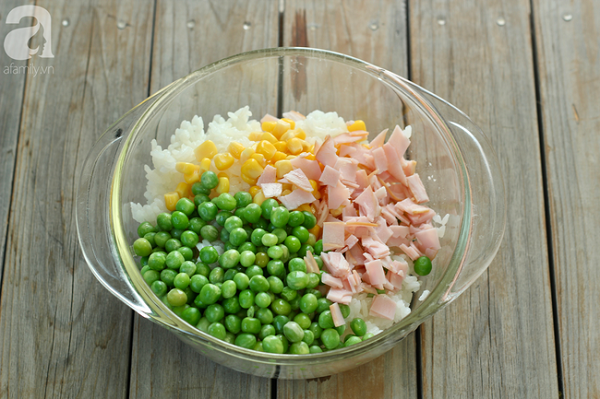 - Bước 4: Cho cơm vào tô trộn, cho hỗn hợp giấm sushi vào rồi thêm bắp, đậu Hà Lan, và thịt cắt nhỏ vào, trộn đều cho cơm và gia vị hòa quyện với nhau.
