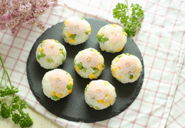 - Bước 5: Trải màng bọc thực phẩm lên thớt, đặt miếng hoa vào giữa rồi múc khoảng 50g cơm đã trộn lên trên. Vo tròn nắm cơm lại sao cho cánh hoa nằm giữa, tiếp tục thực hiện cho đến hết cơm. Bạn có thể làm cơm nắm to hay nhỏ tuỳ thích.
