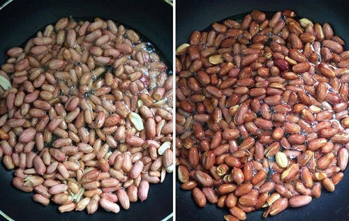 Rang cho tới khi lạc có tiếng nổ lép bép do phần da ngoài của lạc nứt ra thì tắt bếp. Đổ lạc ra bát thêm một chút rượu trắng vào lạc (vì lạc đang nóng nên một lát là rượu bay hơi nhanh chóng). Khi lạc nguội bớt, rắc chút bột canh hoặc muối tinh lên lạc, đảo đều cho muối/bột canh bám đều.