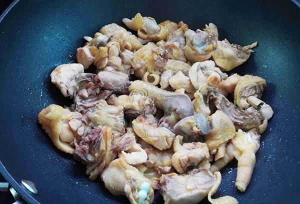 - Bước 1: Đun nóng chút dầu ăn trong chảo, cho thịt gà vào đảo đều cho thịt săn lại rồi trút ra bát.