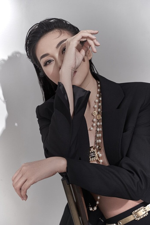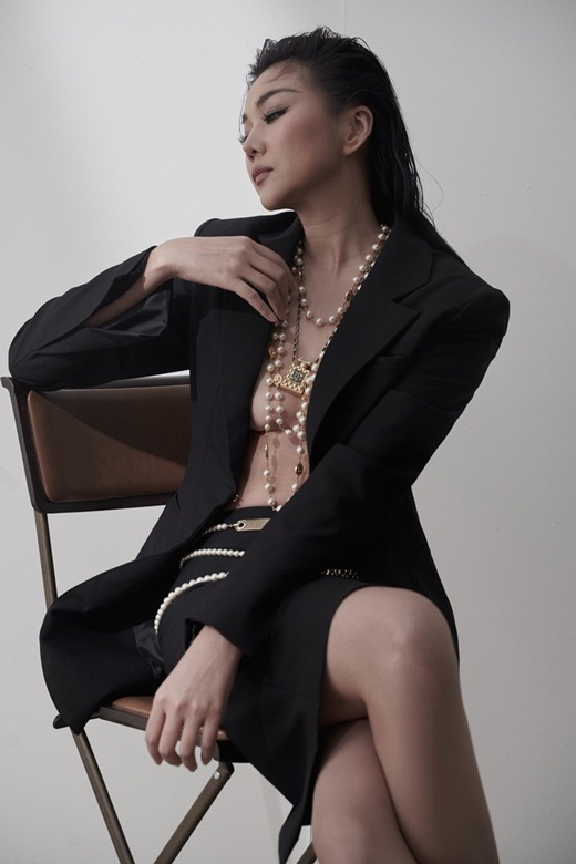 Trong bộ ảnh mới nhất, Thanh Hằng khoe vẻ đẹp gợi cảm và táo bạo trong set đồ áo blazer không nội y kết hợp chân váy ôm, phụ kiện là vòng cổ nhiều tầng mang lại phong cách sang chảnh. |