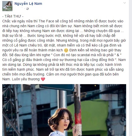 Lệ Nam viết: "Chắc vài ngày nữa, The Face sẽ công bố những nhân tố được bước vào nhà chung nên Nam cũng có đôi lời tâm sự. Nam không biết mình sẽ được đi tiếp hay không nhưng Nam xin được dừng lại. Những chuyện đã qua thật sự tồi tệ. Bước từng bước một, không hề vội vã hay bất chấp để những cố gắng được công nhận. Nhưng không, trong mắt mọi người bây giờ tôi lại là một cô Lệ Nam chiêu trò, lật mặt, nham hiểm và có thể kéo cả gia đình và người yêu ra để hoàn thành màn kịch".