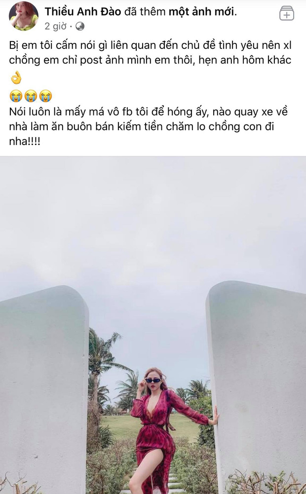 Mới nhất, Thiều Anh Đào - chị gái Thiều Bảo Trâm tiếp tục đã gây chú ý với status trên trang cá nhân. Cô đăng tải một bức ảnh khoe nhan sắc xinh đẹp và tiết lộ: "Bị em tôi cấm nói gì liên quan đến chủ đề tình yêu nên xin lỗi chồng em chỉ post ảnh mình em thôi, hẹn anh hôm khác".