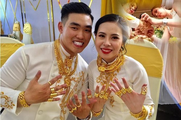 Trong đoạn clip, cô dâu và chú rể diện áo dài trắng rạng rỡ nhận những món quà cưới "siêu khủng" từ chị gái ruột bao gồm cả trang sức và tiền mặt. Không chỉ có nhẫn vàng đeo kín tay mà còn có vòng tay, dây chuyền, kiềng vàng và cả tiền mặt. Theo tiết lộ, tổng số hồi môn cô dâu chú rể nhận được lên tới 2,8 tỷ đồng bao gồm 2,5 tỷ tiền mặt và 49 cây vàng.
