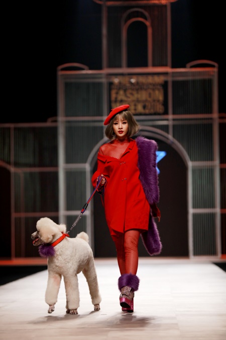 Mặc dù không phải model chuyên nghiệp nhưng nữ diễn viên lại ghi điểm nhờ thần thái kiêu kỳ. Khoảnh khắc Chi Pu dắt chú cún trên sàn diễn đã làm nên điểm đáng nhớ cho Vietnam International Fashion Week Thu Đông 2016.