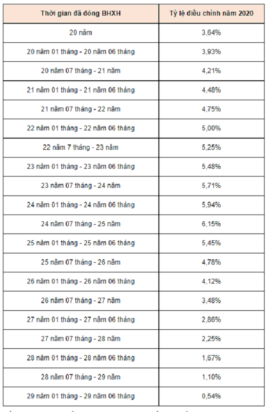 - Mức điều chỉnh được tính bằng mức lương hưu nêu trên nhân với tỷ lệ điều chỉnh tương ứng với thời gian đã đóng bảo hiểm xã hội và thời điểm bắt đầu hưởng lương hưu.