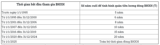 Mức bình quân tiền lương = Tổng số tiền lương tháng đóng BHXH (hệ số x mức lương cơ sở) của T năm cuối trước khi nghỉ việc / (Tx12 tháng)