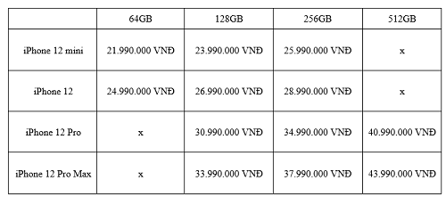 Trong sự kiện diễn ra vào rạng sáng ngày 14/10, Apple chính thức ra mắt mẫu iPhone 12, gồm 4 phiên bản iPhone 12 mini, iPhone 12, iPhone 12 Pro và iPhone 12 Pro Max. Không lâu sau đó, nhiều đại lý ủy quyền của Apple tại Việt Nam cũng như một số cửa hàng bán lẻ đã công bố giá bán dự kiến của dòng iPhone 12 chính hãng.