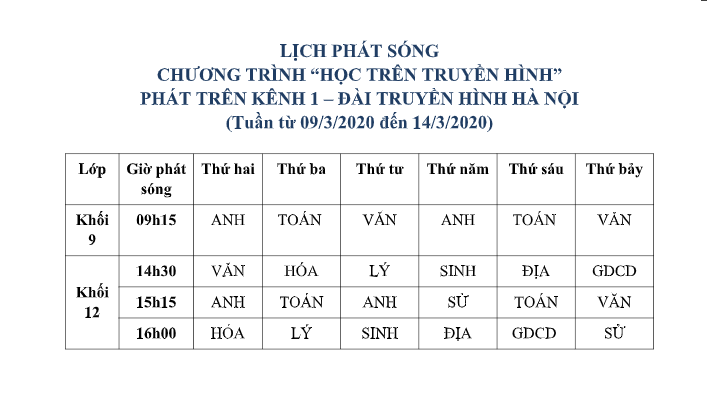 Sở GD-ĐT thông báo lịch phát sóng tuần từ ngày 9-14/3, chương trình dạy học trên truyền hình sẽ được phát sóng trên kênh 1 – Đài Phát thanh và Truyền hình Hà Nội để các em học sinh tham gia học tập.