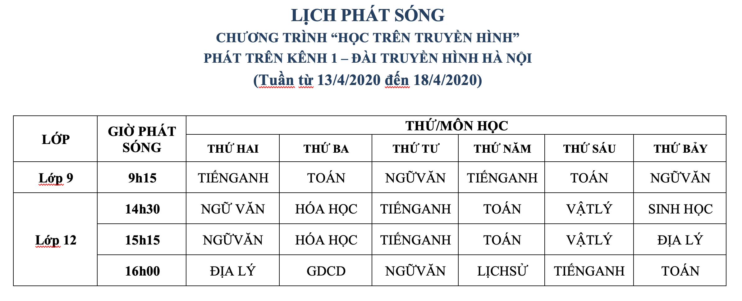 Sở GD-ĐT đề nghị các Phòng GD-ĐT, các trường THPT, trung tâm GDNN-GDTX thông báo kịp thời tới cán bộ, giáo viên, học sinh Lịch phát sóng tuần từ 13/4/2020 đến 18/4/2020 Chương trình dạy học trên truyền hình sẽ được phát sóng trên kênh 1, kênh 2 - Đài Phát thanh và Truyền hình Hà Nội để các em học sinh tham gia học tập.