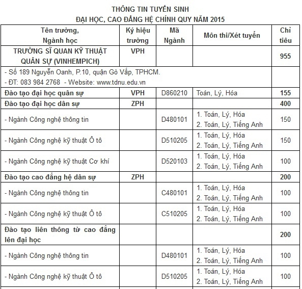 Trường Sĩ quan Kỹ thuật Quân sự Vinhempich xét tuyển 955 chỉ tiêu