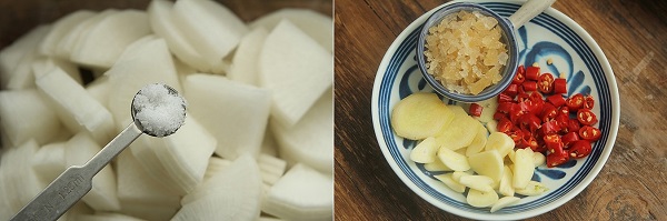 - Bước 2: Cho củ cải vào thố, thêm chút muối vào rồi trộn đều sau đó để khoảng 30 phút cho củ cải tiết ra nước. Trong lúc ướp củ cải thì thái nhỏ ớt, tỏi gừng thái lát, đường phèn giã nhỏ.