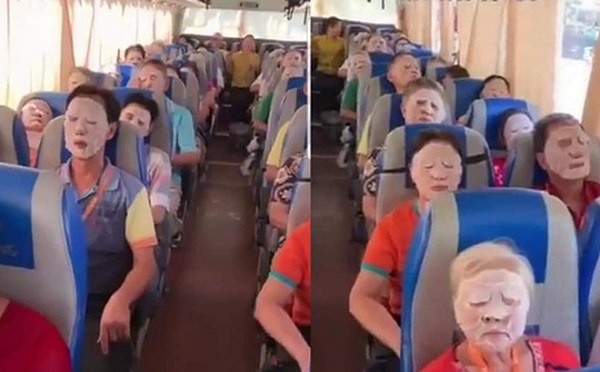 Có lẽ vì thế mà hướng dẫn viên này đã nghĩ ra cách đắp mặt nạ thư giãn cho tất cả hành khách trên xe. Theo hình ảnh hướng dẫn viên chụp lại, cả đoàn xe đều nằm yên lặng theo đúng một tư thế.