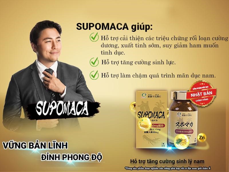Qua tìm hiểu được biết SUPOMACA là sản phẩm tiên phong phối hợp bộ ba SÂM DƯỢC: Sâm Peru (Maca) - Sâm Mã Lai (Bá Bệnh) - Nhâm Sâm Hàn Quốc cùng các tinh chất quý khác như Hàu đại dương và Kẽm hữu cơ hỗ trợ tăng cường sinh lý, bền bỉ sinh lực giúp nam giới giữ vững bản lĩnh và phong độ phái mạnh.