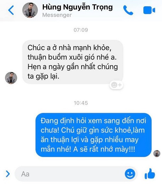Đoạn tin nhắn Trọng Hùng gửi cho nam diễn viên Doãn Quốc Đam trước khi sang Đức định cư. |