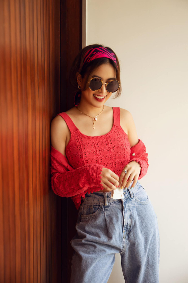 Hoàng Thùy Linh diện trang phục thời thượng phối cùng túi xách siêu nhỏ. |