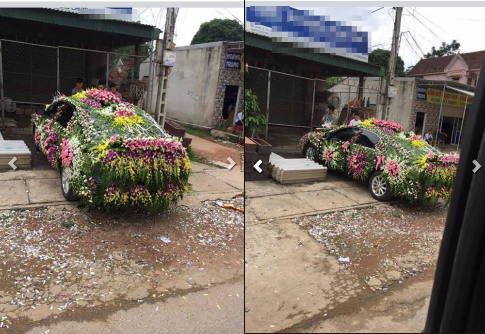 (ĐSPL) – Chiếc xe dâu được trang trí bằng hoa tươi kín mít từ mui xe, đuôi xe cho đến cửa xe khiến dân mạng không khỏi bàn tán xôn xao.