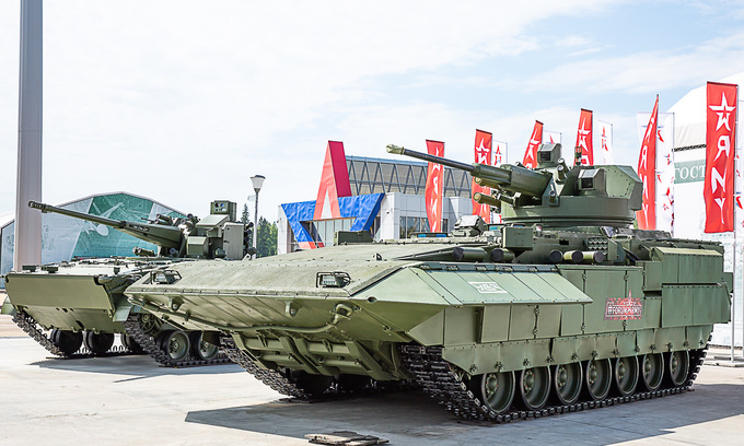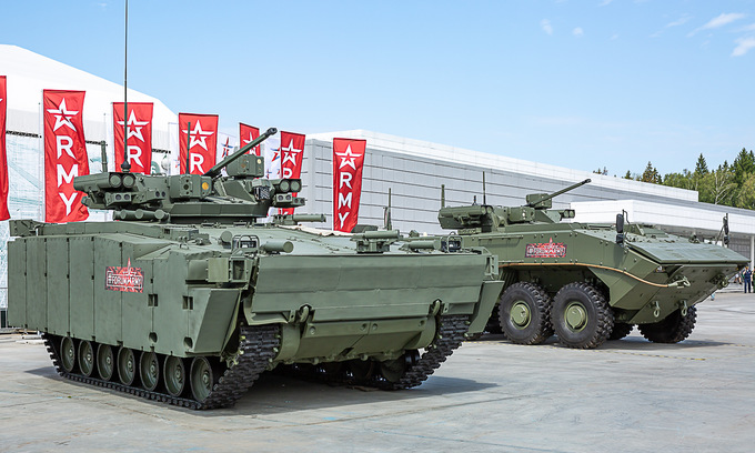 Xe chiến đấu bộ binh Kurganets-25 (trái) và xe thiết giáp chở bộ binh Bumerang, hai loại khí tài ra mắt cùng thời điểm với dòng T-14 Armata. Ảnh: Said Aminov |