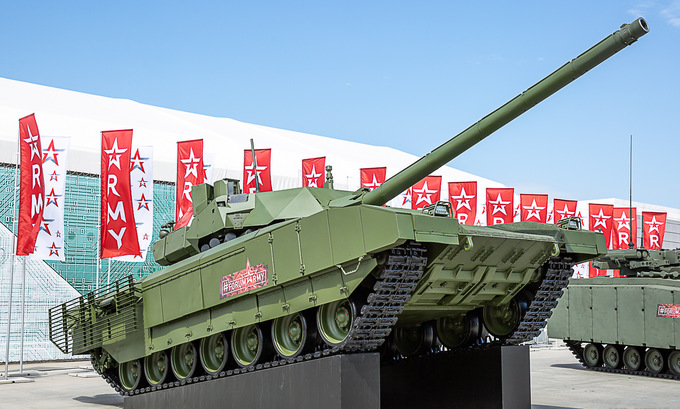 Siêu tăng T-14 Armata được đặt trên bệ trưng bày. Ảnh: Said Aminov |