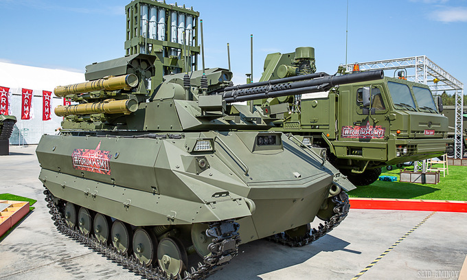Robot chiến đấu tự động Uran-9 được trang bị pháo chính 2A72 cỡ nòng 30 mm, một súng máy cỡ 7,62 mm và 4 tên lửa chống tăng 9M120 Ataka. Ảnh: Said Aminov |