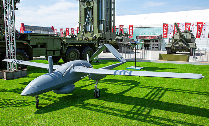 Máy bay chiến đấu không người lái (UCAV) Korsar chuyên làm nhiệm vụ trinh sát, vận tải, tác chiến điện tử và tấn công chính xác bằng tên lửa chống tăng Ataka. Ảnh: Said Aminov |