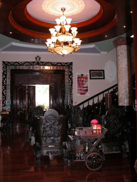 | Tại phòng khách là bộ bàn ghế đồng kị được làm bằng loại gỗ quý hiếm. |