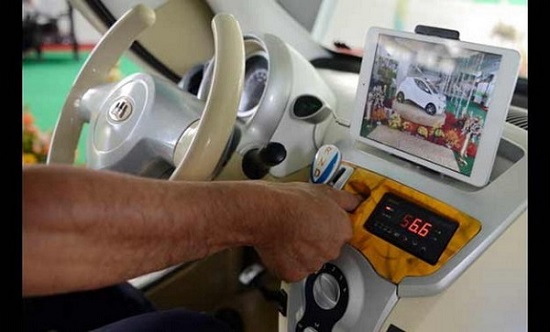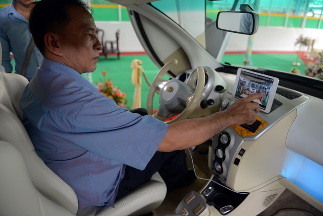 Nhà thiết kế Nhean Phalloek đang kiểm tra màn hình cảm ứng bên trong chiếc Angkor EV 2013, được biết ô tô điện còn được lắp đặt công nghệ quét dấu vân tay để mở cửa và sử dụng thẻ điện tử thay cho khóa để khởi động máy. |