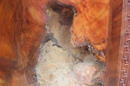 Điều đặc biệt, ngẫu nhiên trong khối gỗ thể hiện sự phong thủy "Mộc ngậm thạch" (trong gỗ có đá - PV). |