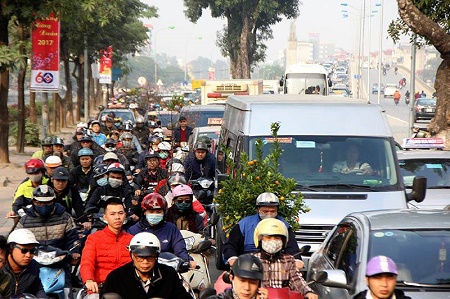 (ĐSPL) - Khoảng hơn một tuần nay, mật độ phương tiện giao thông trên các tuyến phố khắp trung tâm Hà Nội tăng đột biến. Chiều 27 Tết, xe cộ nối thành hàng dài tưởng như bất tận.