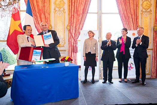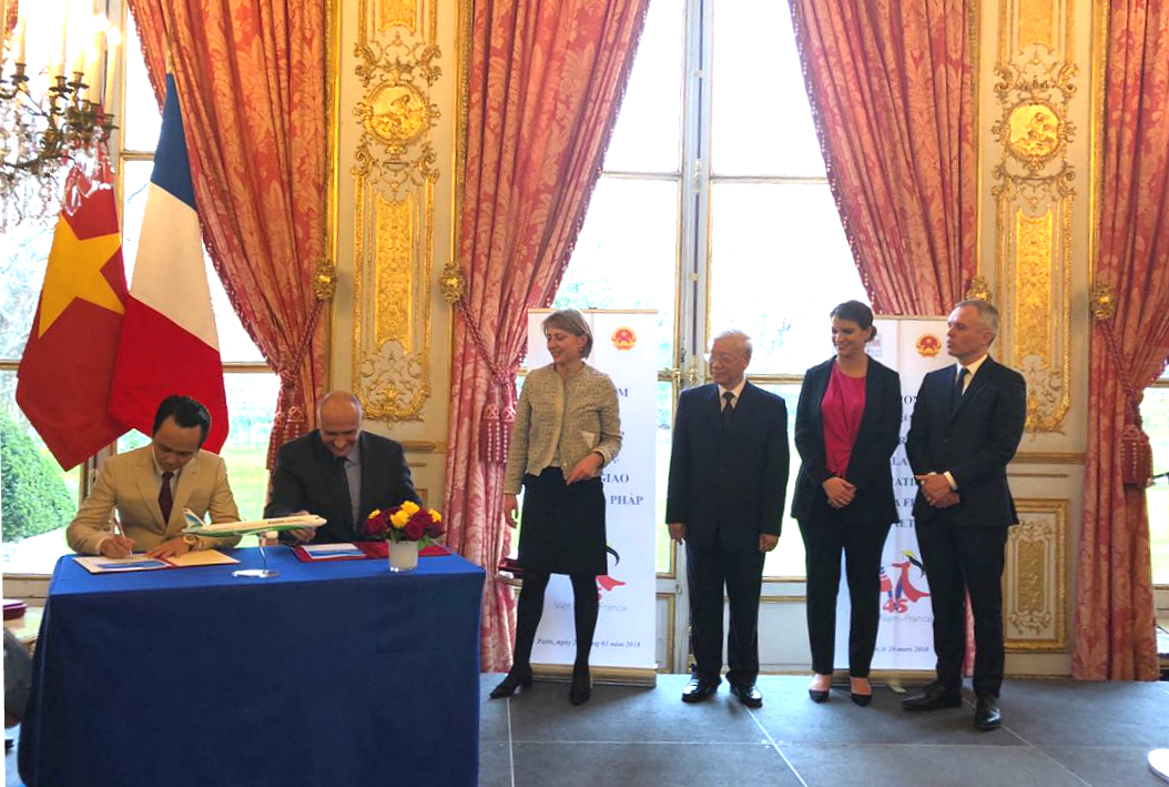 | Chủ tịch Tập đoàn FLC Trịnh Văn Quyết (trái) và Phó Chủ tịch Airbus phụ trách thương mại Eric Schulz (phải) ký kết hợp đồng thoả thuận mua 24 máy bay A321NEO cho Bamboo Airways dưới sự chứng kiến của Tổng Bí thư Nguyễn Phú Trọng và Chủ tịch Quốc hội Pháp François de Rugy vào tháng 3/2018 tại Pháp. |