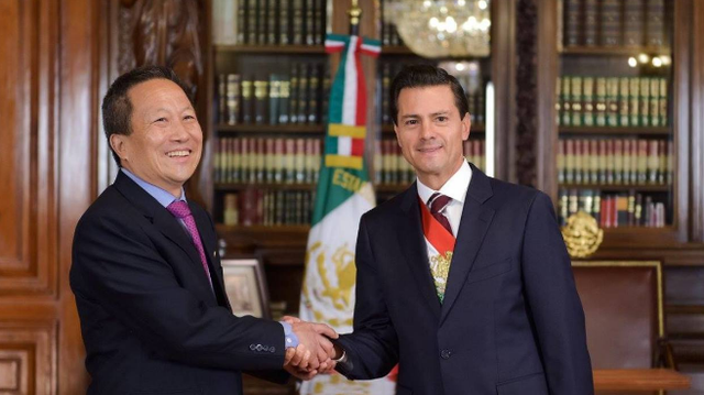 Đại sứ Triều Tiên tại Mexico Kim Hyong Gil (trái) và Tổng thống Mexico Enrique Pena Nieto - Ảnh: Debate.com. |