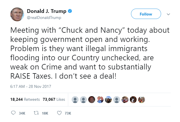 Ông Trump hôm 28/11 đã chia sẻ trên Twitter về cuộc gặp gỡ với lãnh đạo phe Dân chủ ở Thượng viện, ông Charles Schumer, và lãnh đạo phe Dân chủ ở Hạ viện, bà Nancy Pelosi để bàn về việc giữ cho chính phủ tiếp tục mở cửa hoạt động.